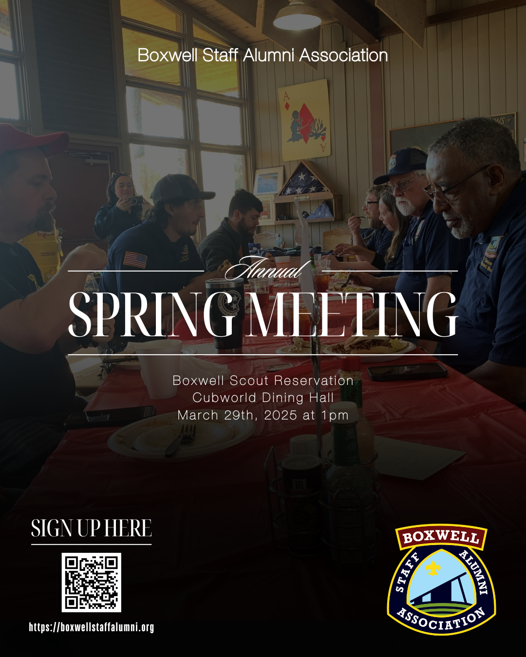 The Boxwell Staff Alumni Association boardThe Boxwell Staff Alumni Association (BSAA) Board would like to invite you to our Spring meeting and dinner/cookout to be held on Saturday March 29, 2025 starting at 1:00 PM at the Cubworld Dining Hall. The Spring meeting is a gathering that will be open to the BSAA membership and their guests. New members can also sign up at the event. We will also conduct our annual business meeting and discuss some of our upcoming plans for the Association. This is not a reunion or camp wide event since other areas of the reservation are in use by other groups. We ask that you remain at Cubworld dining hall while at Boxwell. Tickets for dinner must be purchased ahead of time so we know how much food to order. Tickets may be purchased up to March 24th. Tickets are $15 per person to cover the cost of dinner for association members and their guests (including children). The business meeting will begin at 1:45 PM. If you do not want to join us for lunch at 1:00 PM you are still welcome to join us at 1:45 PM for the business meeting.