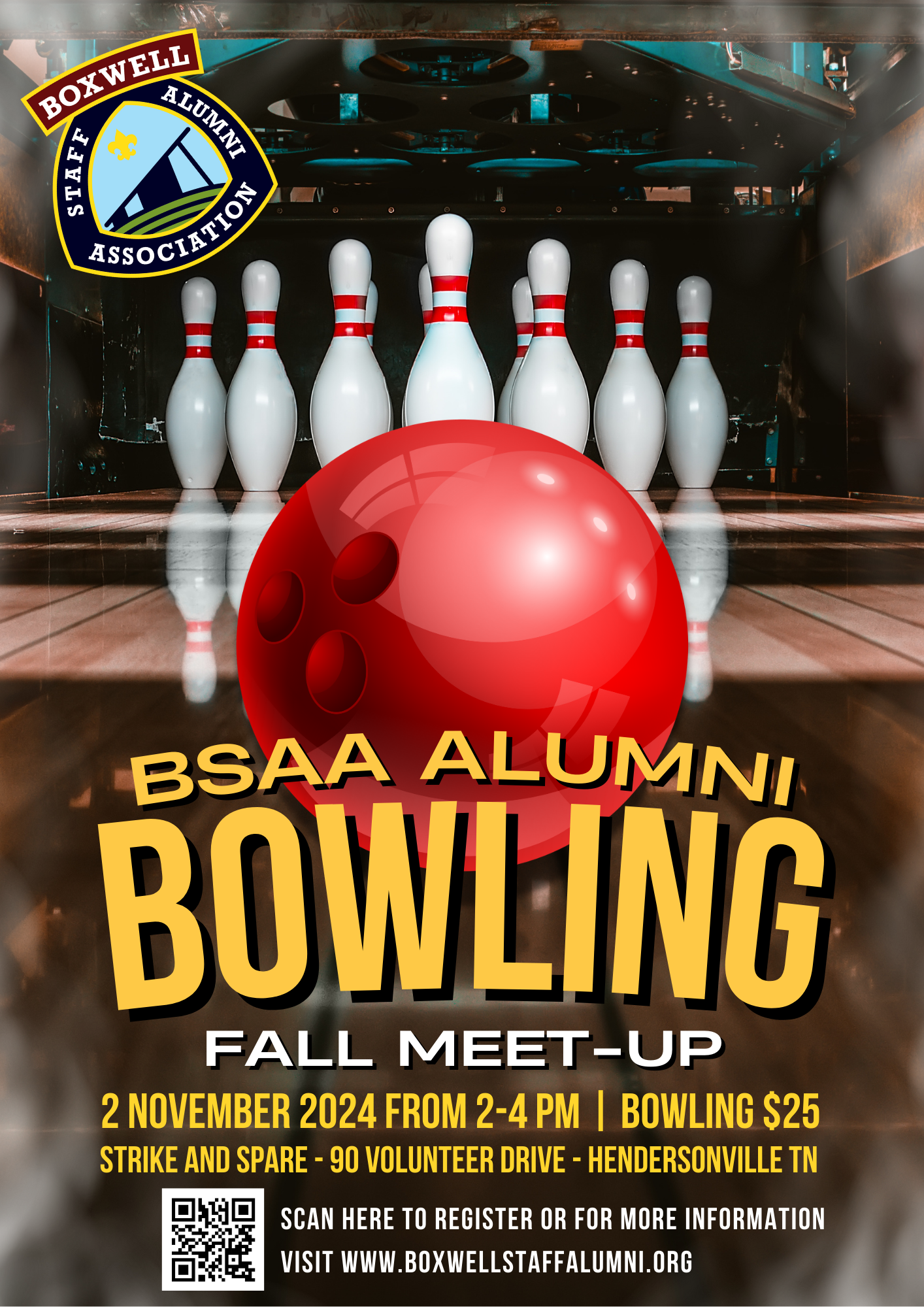 The Boxwell Staff Alumni Association board along with the Special Events Committee would like to invite you to our Fall Meet-up. This year the Fall Meet-up will be an Alumni Bowling event to be held on November 2, 2024 from 2 to 4 PM at the Hendersonville Strike and Spare located at 90 Volunteer Drive in Hendersonville, TN. The Fall meet-up will be open to the BSAA membership, their family and their guests.